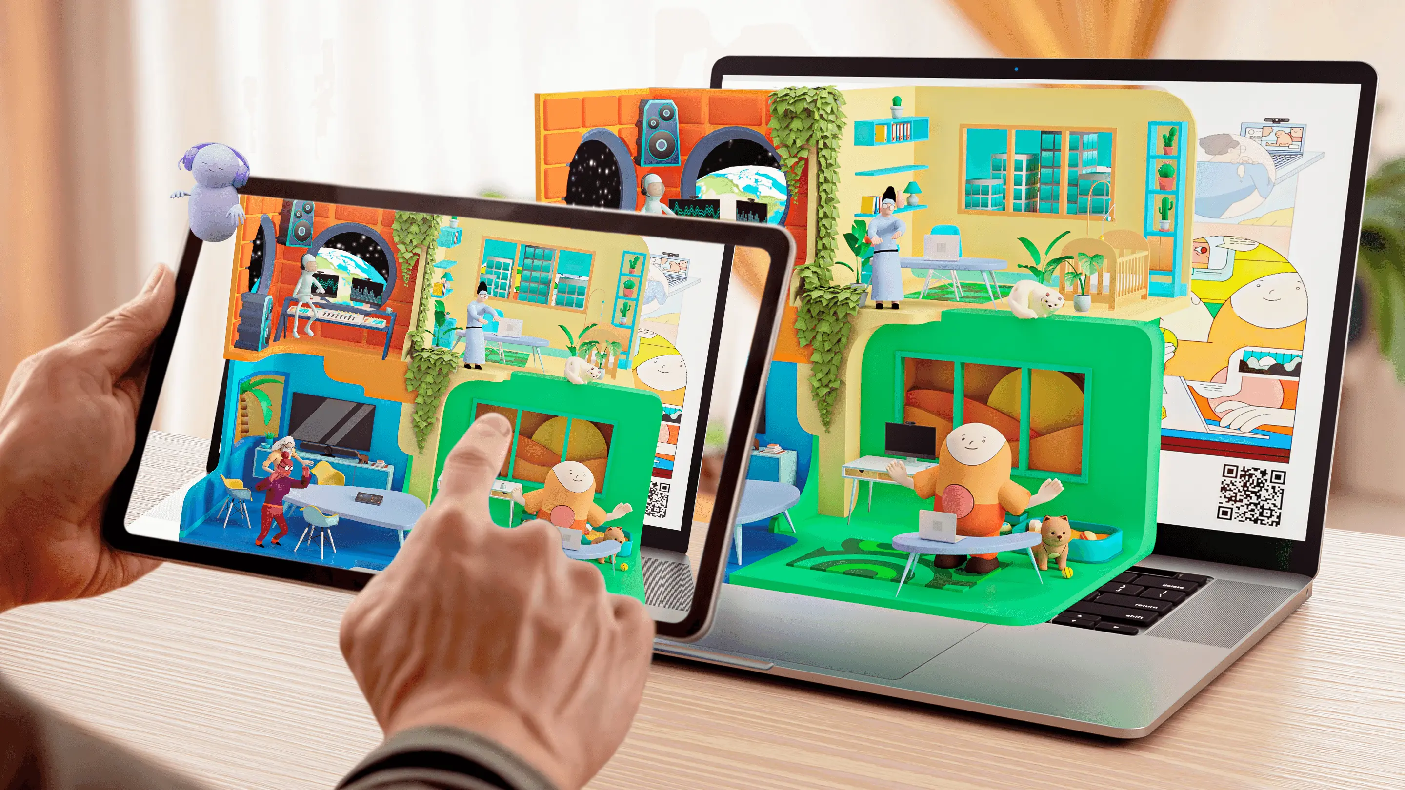 We worked with the Logitech video collaboration marketing team to create an innovative and immersive augmented reality experience chock full of art, animations, music, and storytelling. The experience is launched from digital artwork created by Portland, Oregon artist Goldsuit, and doesn’t require an app download to be experienced. When the AR launches, users are invited to activate different hybrid work “worlds” that are inhabited by interesting characters, who eventually come together, thank to users, to celebrate as one at the end of the experience.