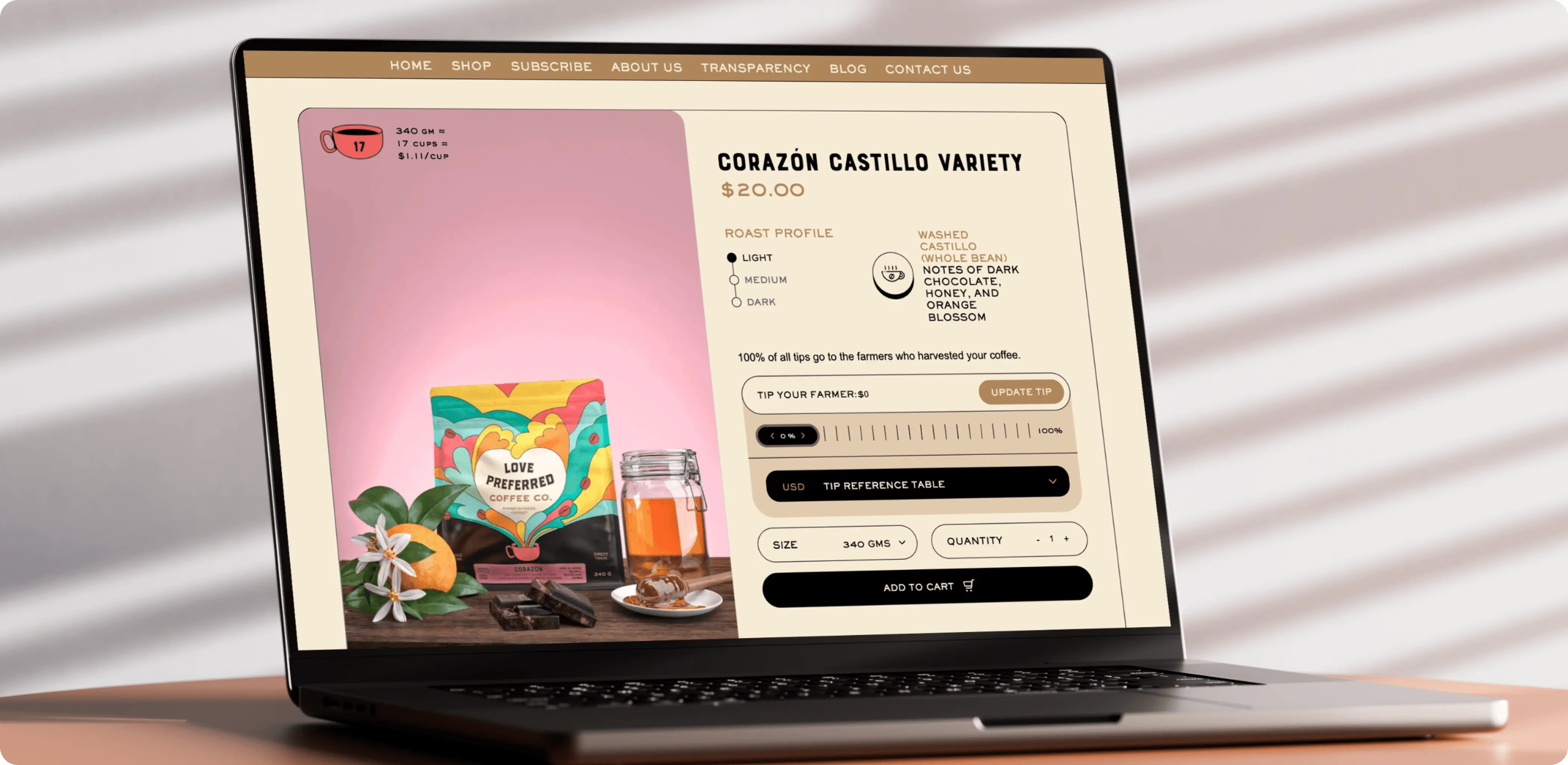 Augmented Island Studios built Love Preferred Coffee a bespoke e‑commerce site that does more than sell beans—it channels customer tips straight to Colombian farmers via a custom “Farmer Dividend” module. The brief demanded we spotlight tasting notes, AR features, and subscriptions without diluting the brand’s social mission. A clean, mobile‑first design, intuitive donation prompts, and celebratory micro‑interactions keep product, purpose, and user delight perfectly balanced—proof that smart design and precise engineering can turn a storefront into a force for good.