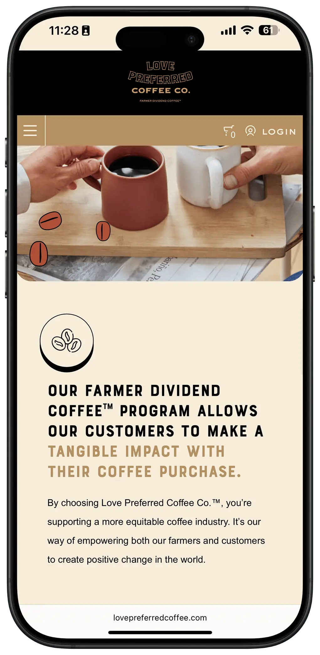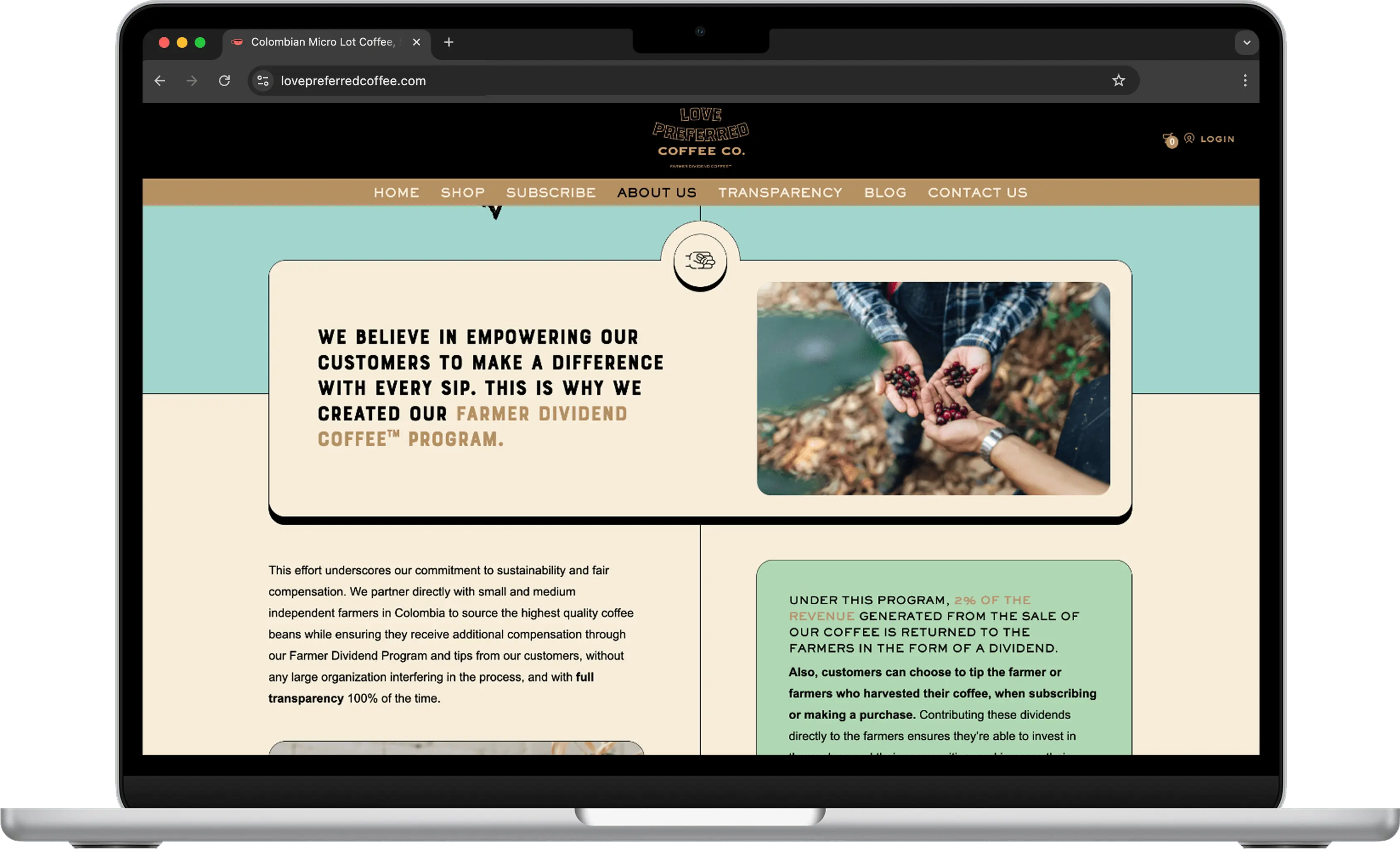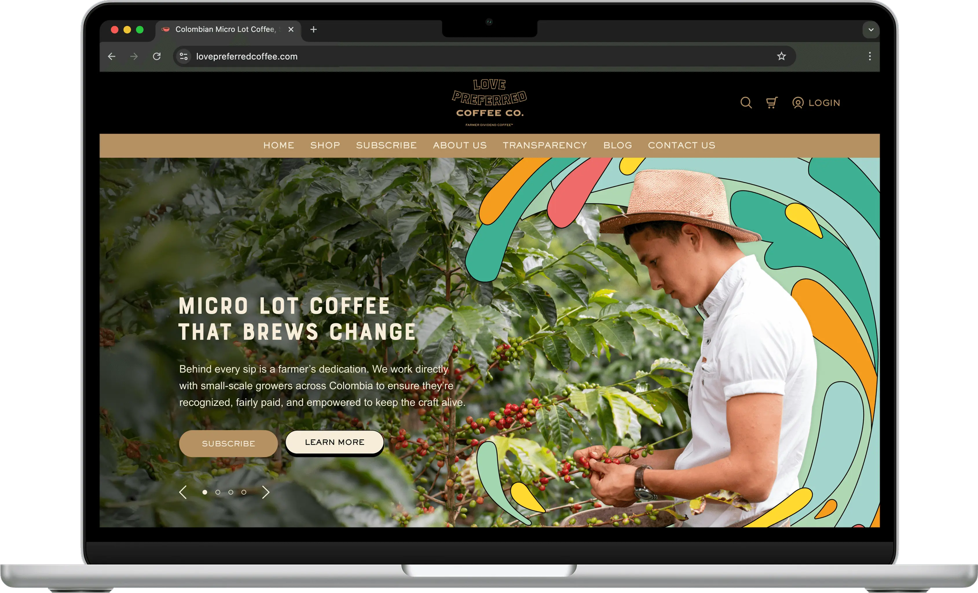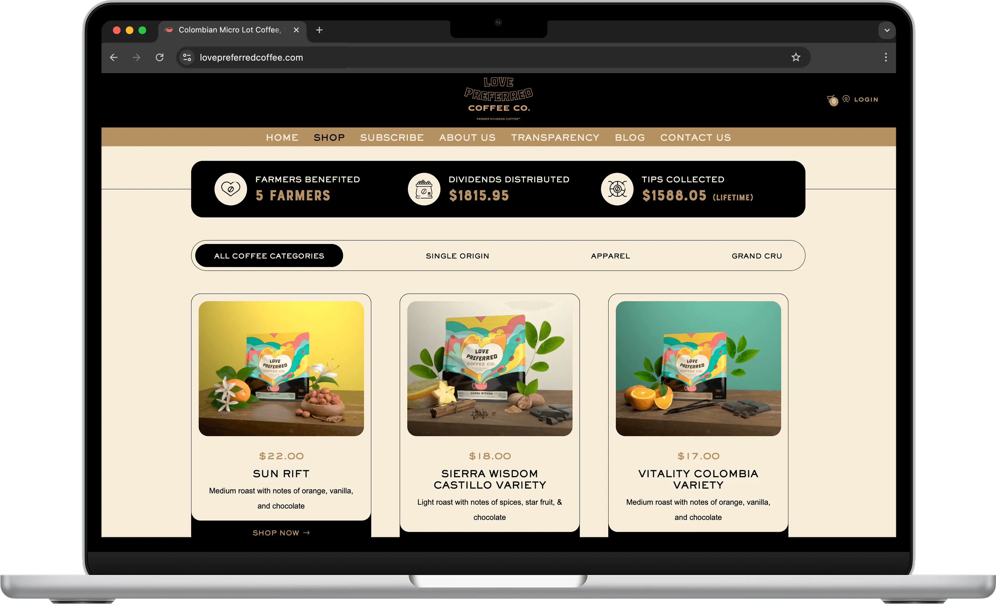 We crafted Love Preferred Coffee’s digital home to do more than showcase beautiful beans—it turns every click into tangible support for Colombian farmers. The site pairs an elegant, story‑driven shop with a custom “Farmer Dividend” checkout, letting customers tip growers in real time while exploring origin maps, AR features, and tasting notes. Clean design, intuitive UX, and robust back‑end engineering keep product discovery effortless and the brand’s social mission front‑and‑center, proving that commerce and conscience can share the same cup.