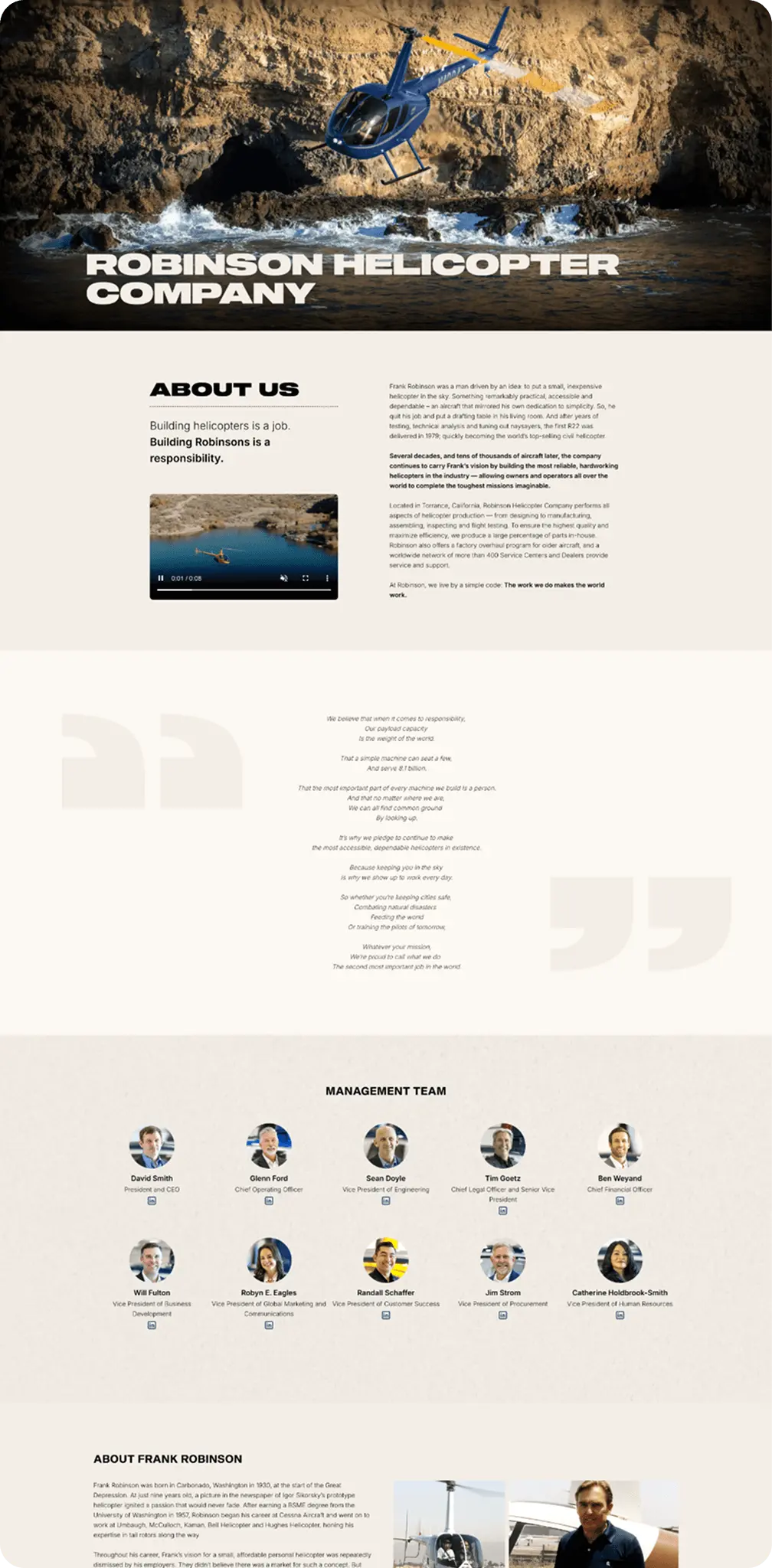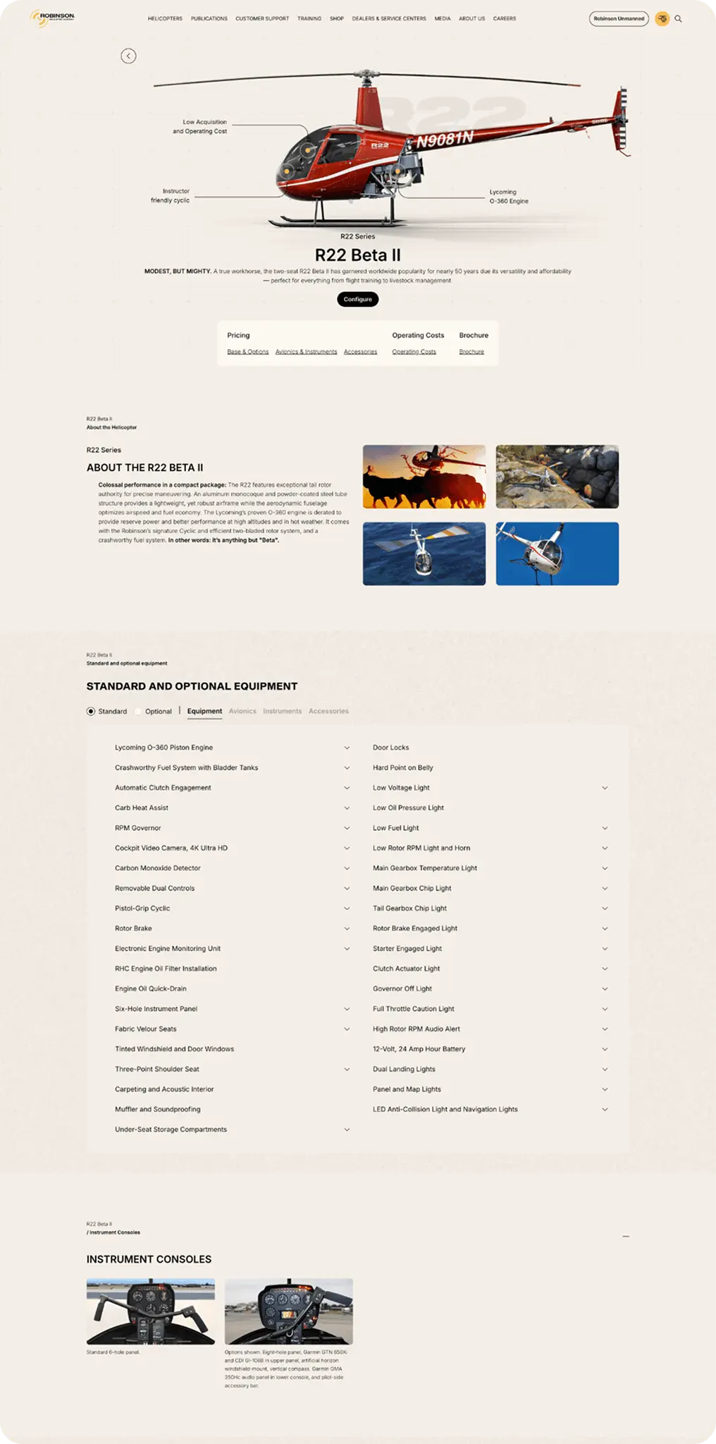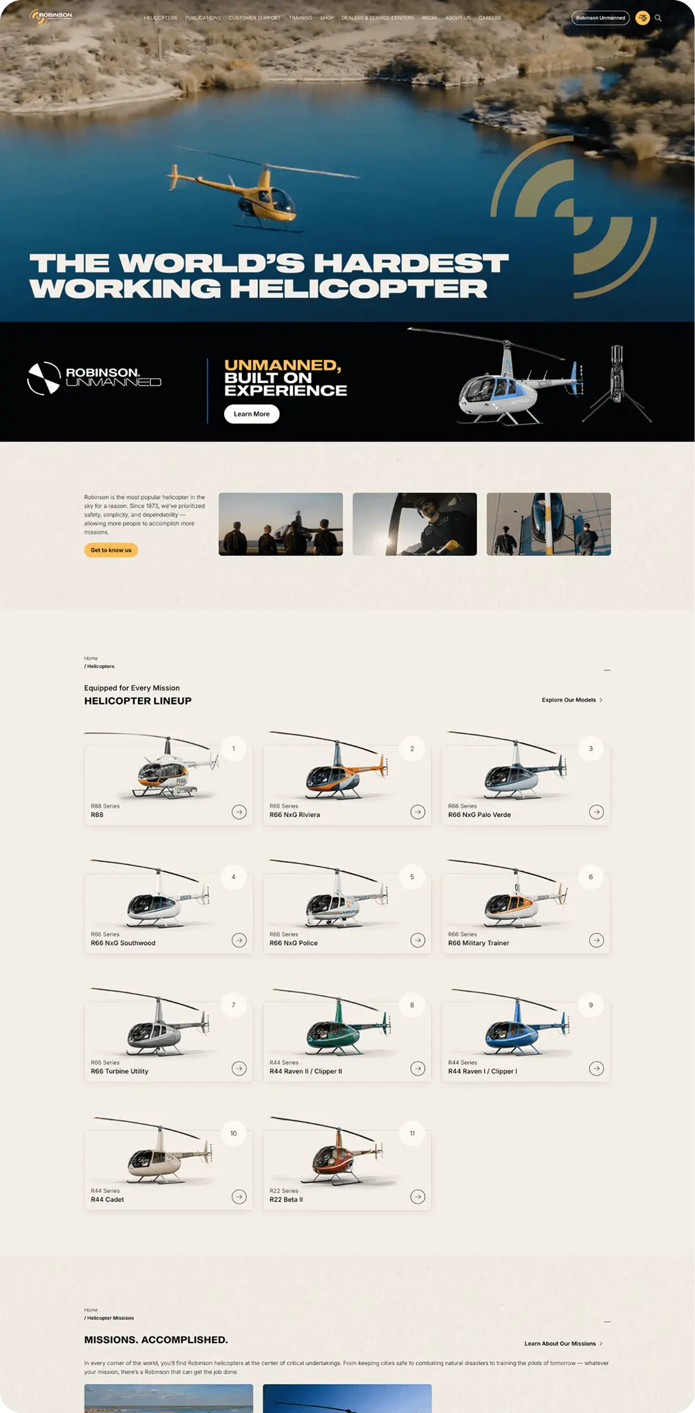 We partnered closely with Robinson Helicopter Company to lead the complete redesign and development of their website, creating a modern, responsive digital experience that reflects the company’s legacy of innovation and quality. In addition to rebuilding the site architecture and UI, we’ve supported Robinson with the design and development of targeted landing pages and collateral for key product launches—ensuring consistency across platforms while highlighting new aircraft features and capabilities in a visually compelling way. Immersive experiences are also on the horizon!