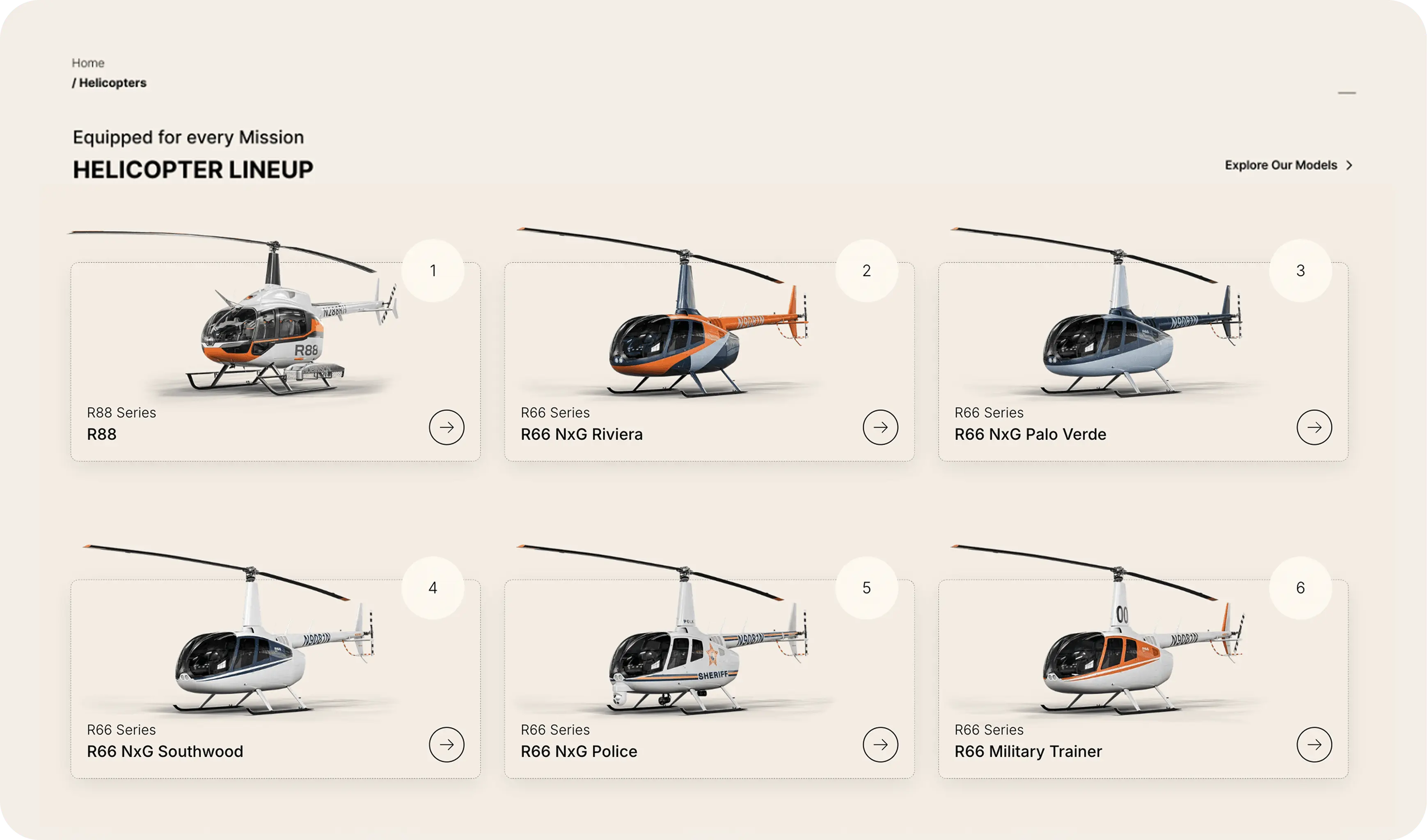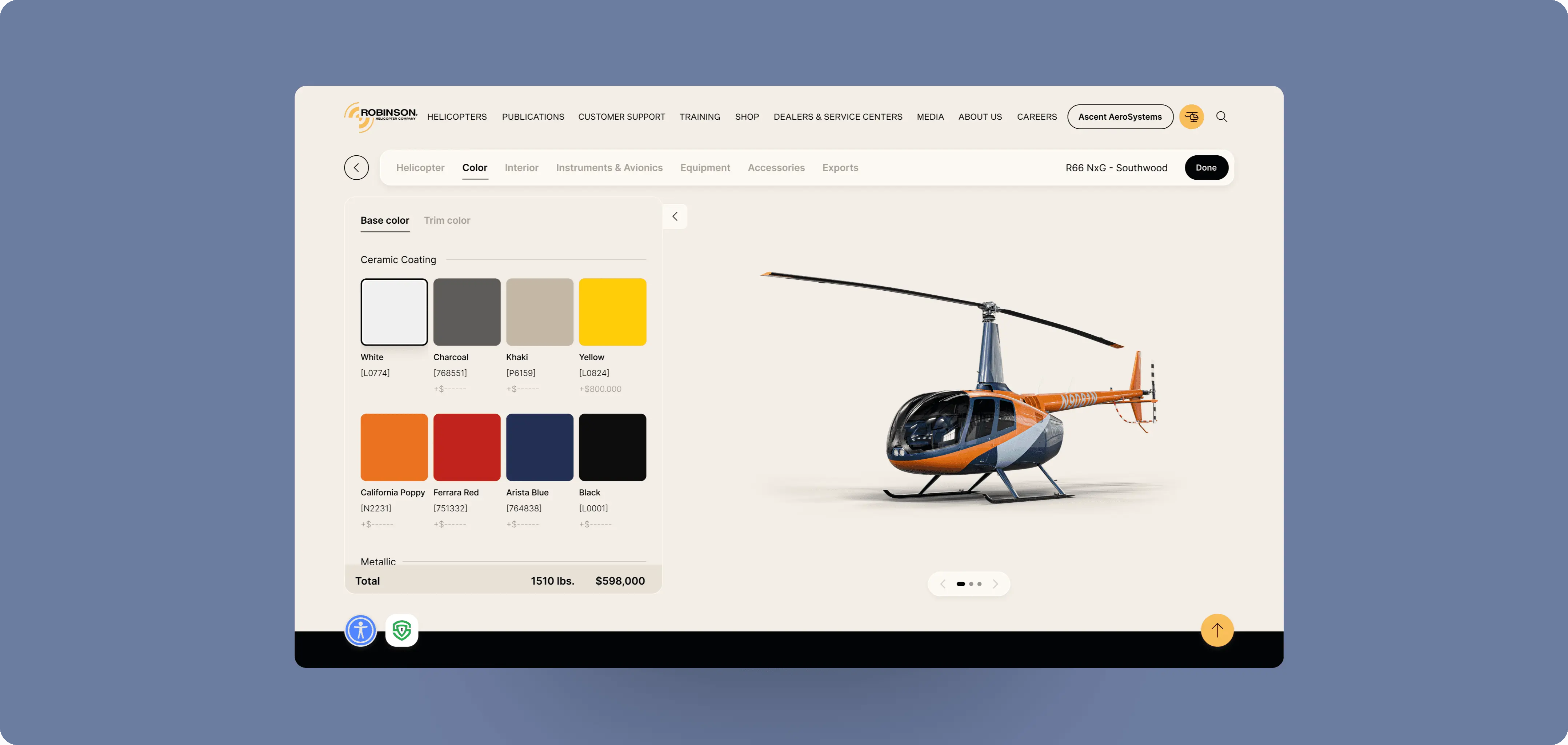 We developed a fully interactive 3D configurator that allows users to explore Robinson helicopters from every angle in real time. Built with optimized 3D models, the configurator lets customers rotate the aircraft, zoom in on details, and view various color schemes and configurations directly in their browser. This tool provides a dynamic, hands-on experience that enhances product discovery and supports purchase decisions—bridging the gap between static visuals and an in-person showroom.
