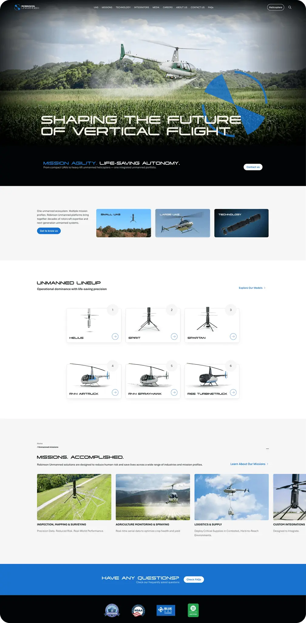 We partnered with Robinson Helicopter Company to navigate their most significant evolution yet: the integration of three distinct pillars under one unified brand. By aligning Robinson’s legendary manufacturing heritage with a dedicated Unmanned division and the specialized coaxial technology of Ascent AeroSystems, we created a digital ecosystem that represents the full spectrum of vertical flight. This evolution is anchored by a suite of high-fidelity, photorealistic renders that bring these diverse platforms to life with clinical precision. This isn't just a website update; it’s the digital architecture for the future of multi-domain aviation.